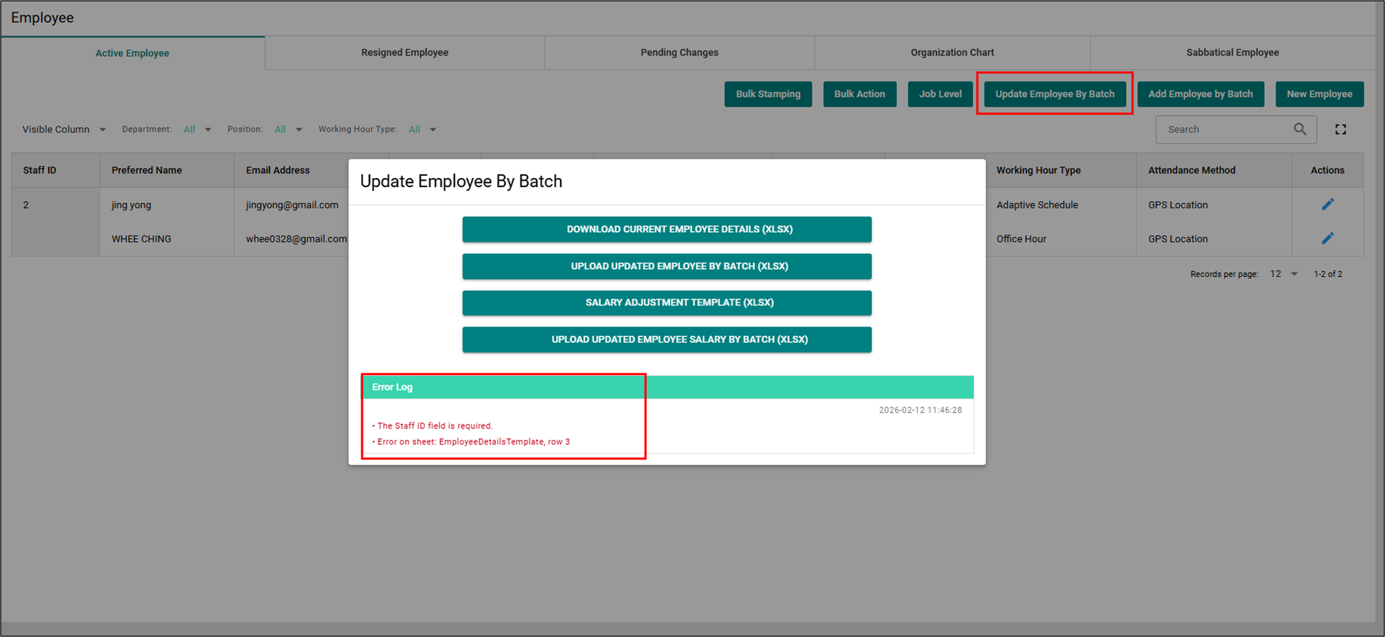 c) Once the updates are complete, import the file by clicking the “Upload Updated Employee By Batch” button.